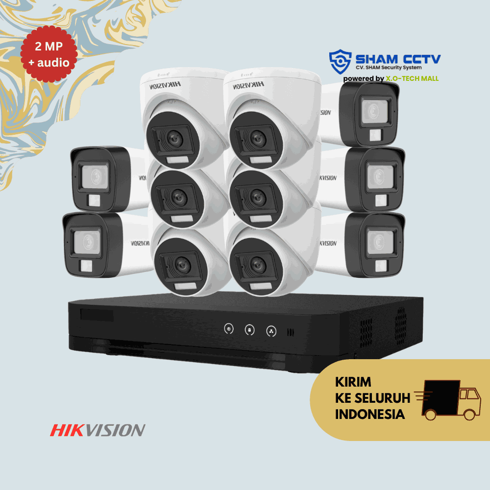 - 11x Kamera Hikvision 2MP Audio – resolusi Full HD 1080p dengan mikrofon internal