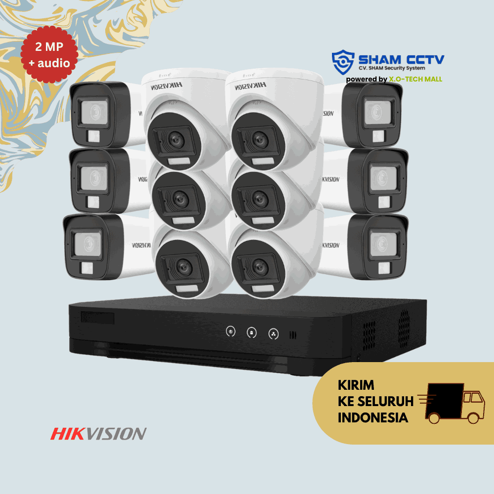 - 12x Kamera Hikvision 2MP Audio – resolusi Full HD 1080p dengan mikrofon internal